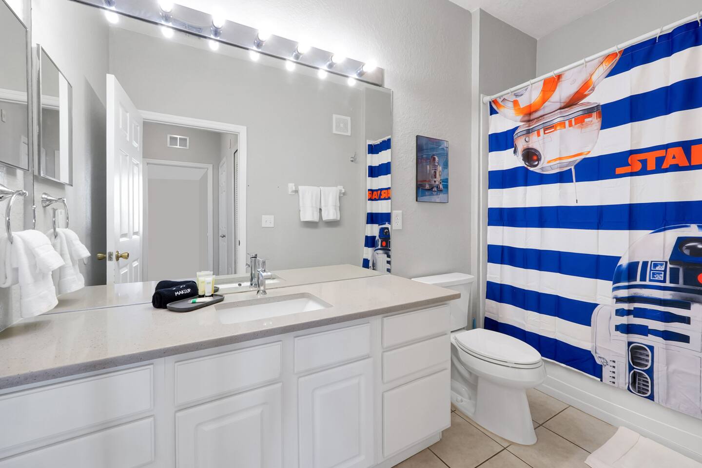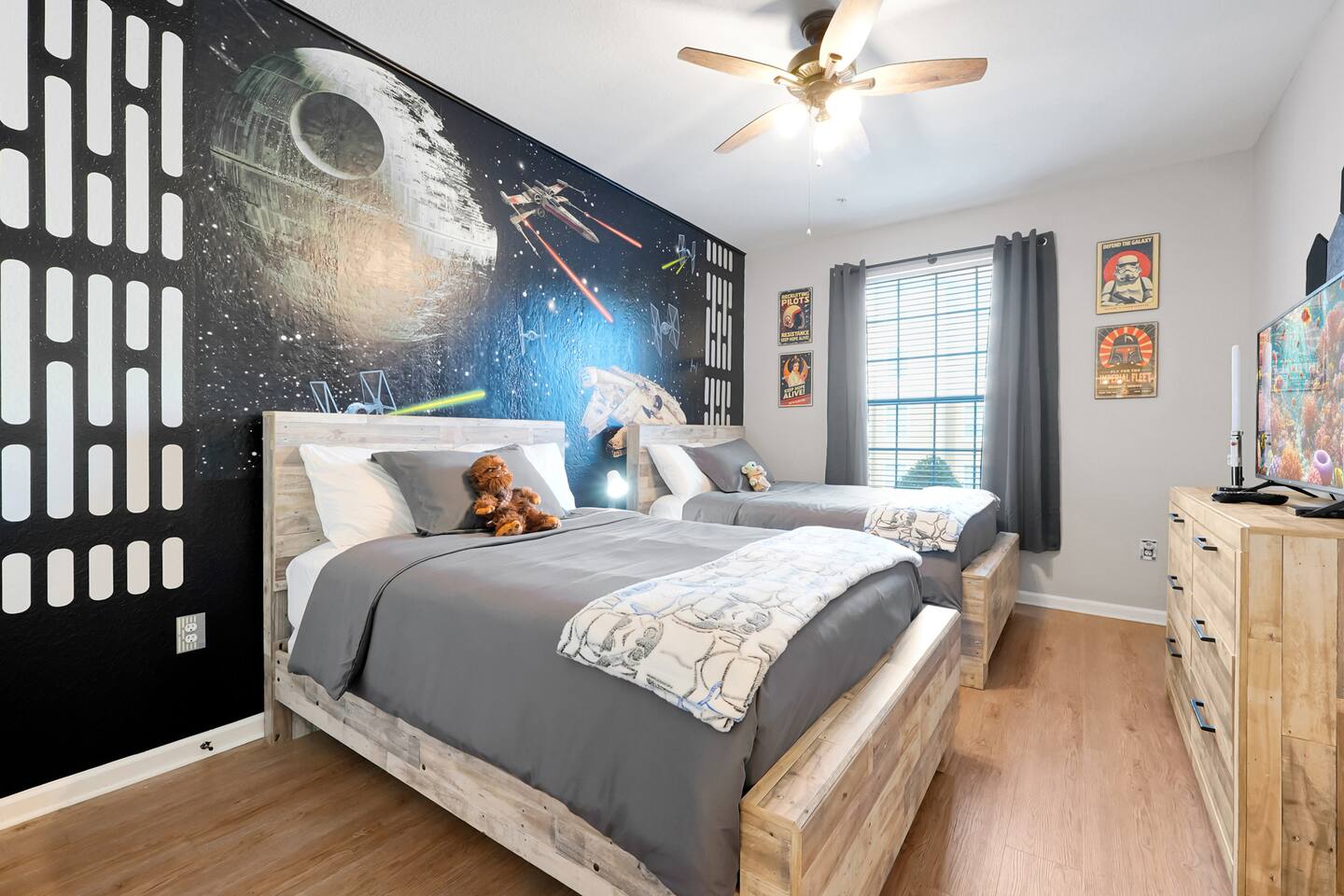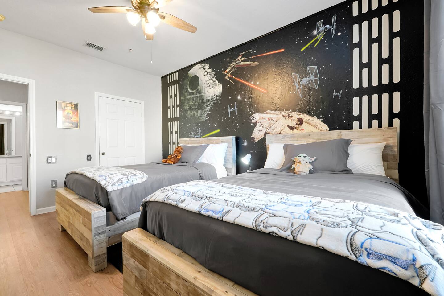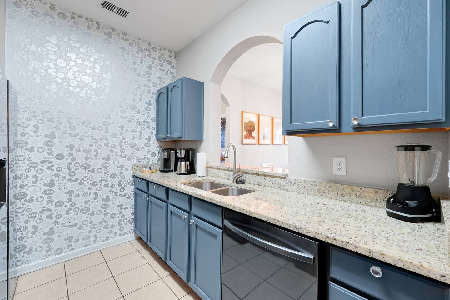 Please note: The water park will be closed from January 5th, 2026 to approximately February 14th, 2026 for refurbishment of the slides and fountains. The heated pool, spa and all other amenities will be open during this time. Please reach out with any questions. •2-bedroom, 2-bath condo just 2 miles from Disney World ✨ •Primary suite: 1 king bed, en suite bathroom, subtle Mickey wallpaper framed by modern wood panels, blackout curtains, and Smart TV 🛏️ •Second bedroom: 2 full beds, epic Star Wars mural ⚔️, themed artwork, blackout curtains, and Smart TV •Living room: Queen sleeper sofa, blackout curtains, Smart TV, and tasteful Disney artwork 🎨 •Kitchen: Fully stocked with all dishware/utensils, air fryer, blender, Keurig ☕, drip coffee maker, and more •In-unit washer & dryer for your convenience 🧺