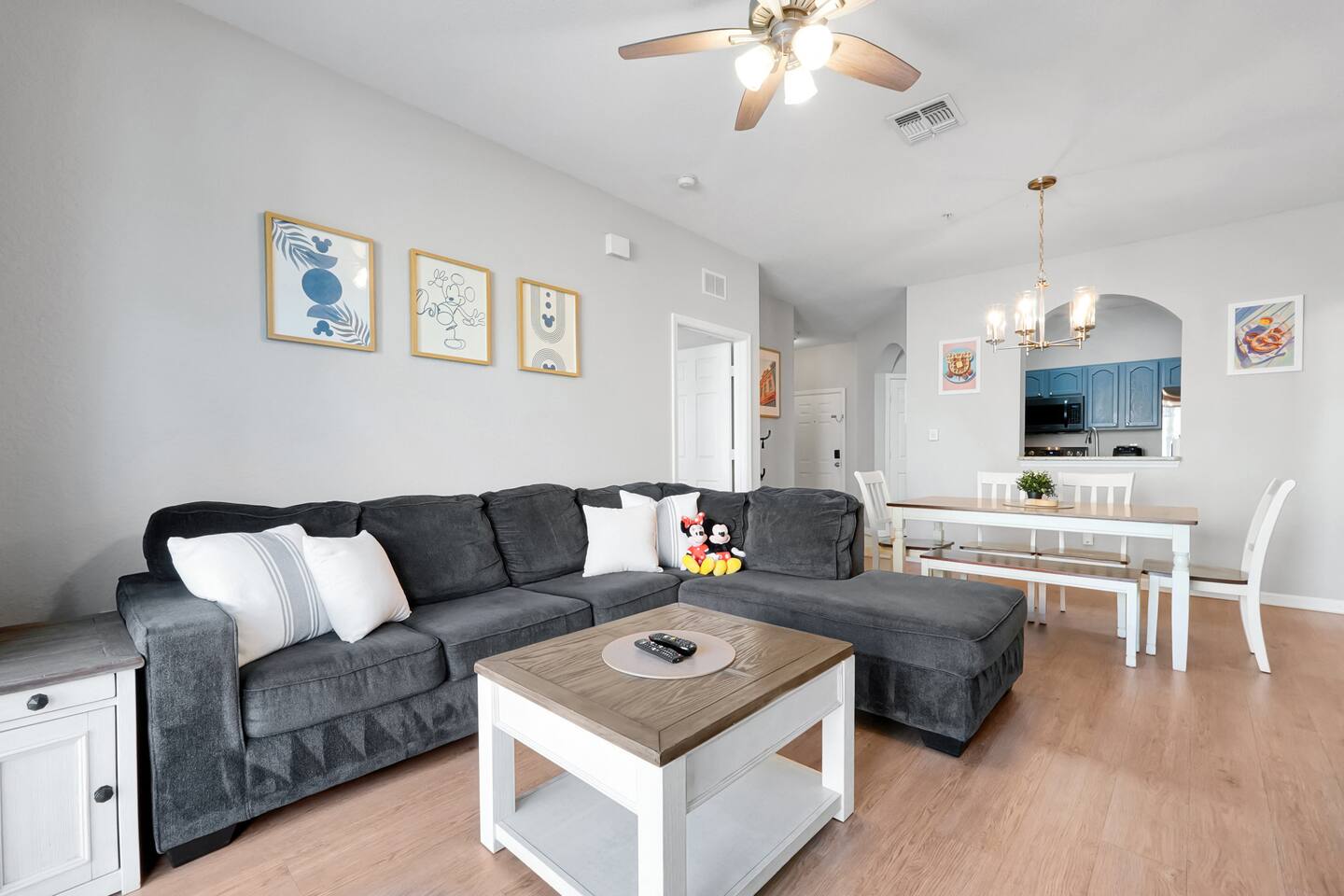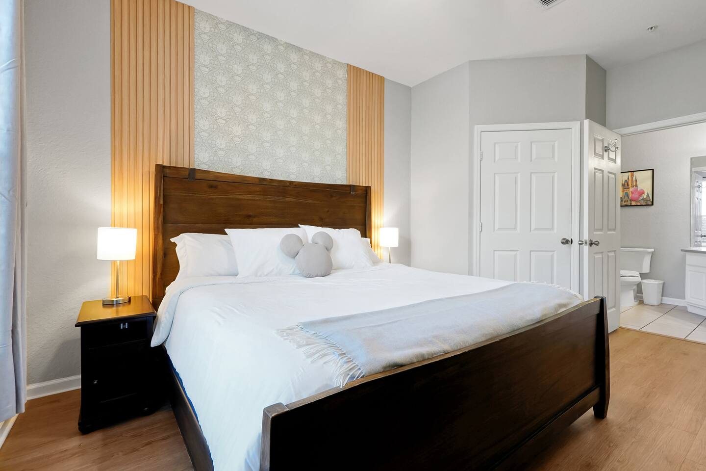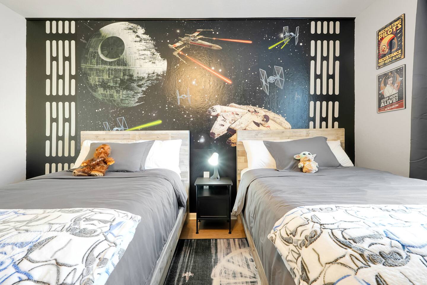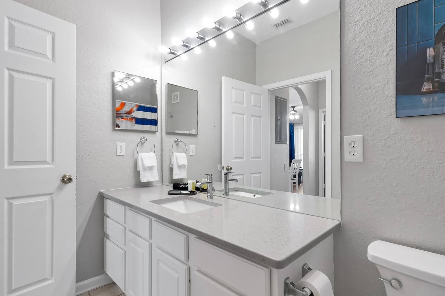Please note: The water park will be closed from January 5th, 2026 to approximately February 14th, 2026 for refurbishment of the slides and fountains. The heated pool, spa and all other amenities will be open during this time. Please reach out with any questions. •2-bedroom, 2-bath condo just 2 miles from Disney World ✨ •Primary suite: 1 king bed, en suite bathroom, subtle Mickey wallpaper framed by modern wood panels, blackout curtains, and Smart TV 🛏️ •Second bedroom: 2 full beds, epic Star Wars mural ⚔️, themed artwork, blackout curtains, and Smart TV •Living room: Queen sleeper sofa, blackout curtains, Smart TV, and tasteful Disney artwork 🎨 •Kitchen: Fully stocked with all dishware/utensils, air fryer, blender, Keurig ☕, drip coffee maker, and more •In-unit washer & dryer for your convenience 🧺