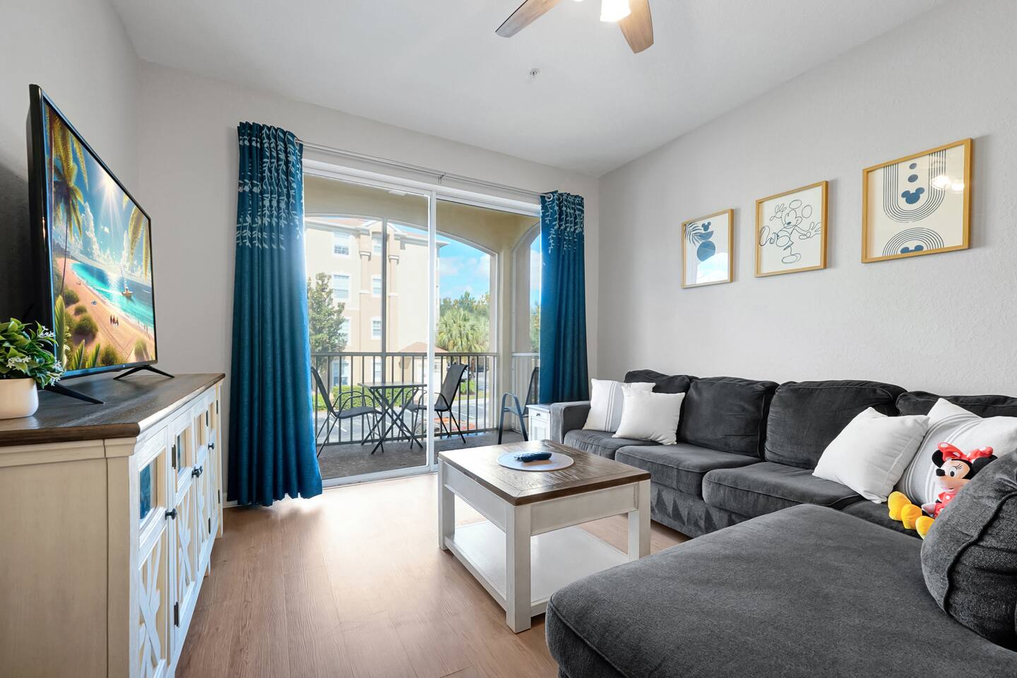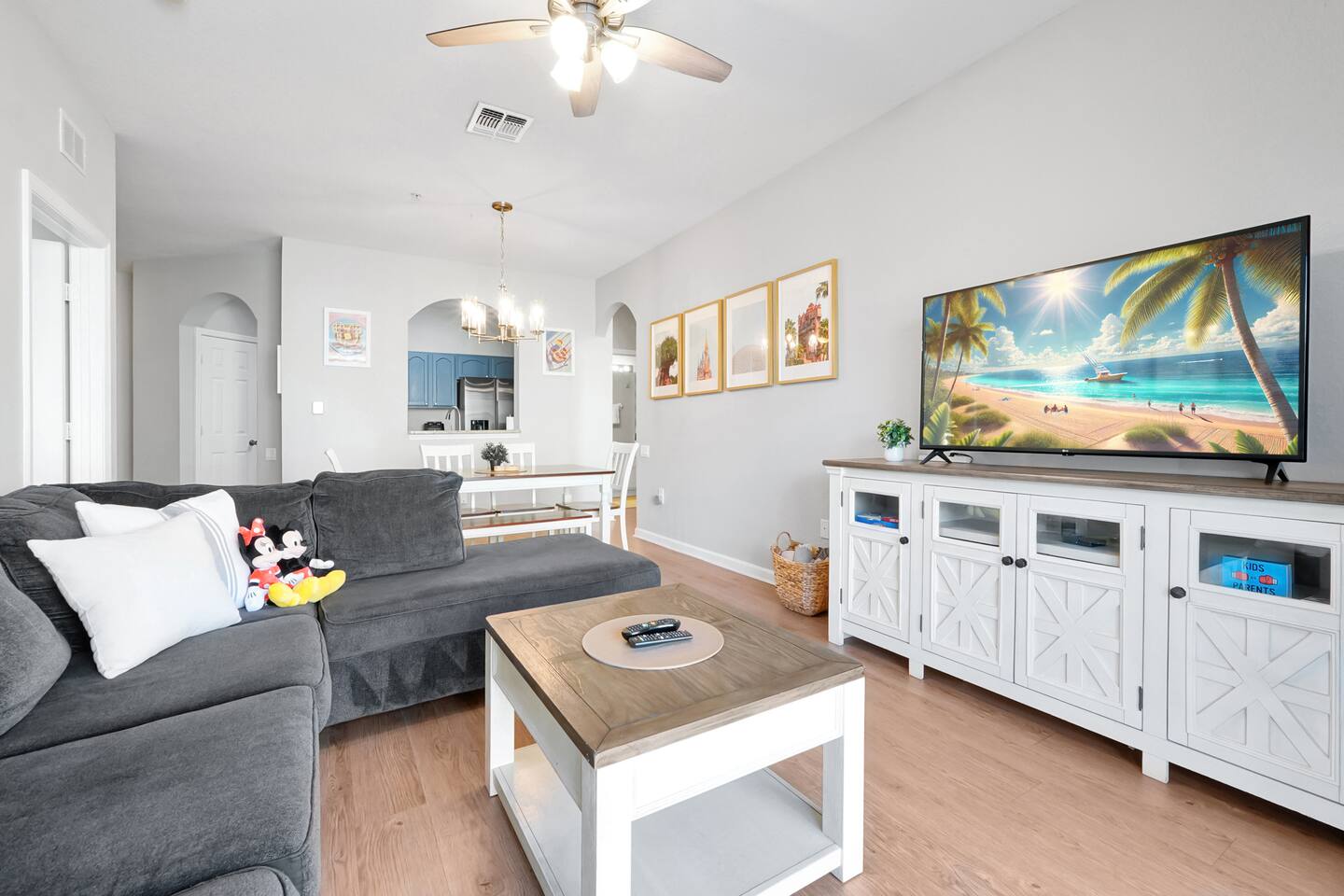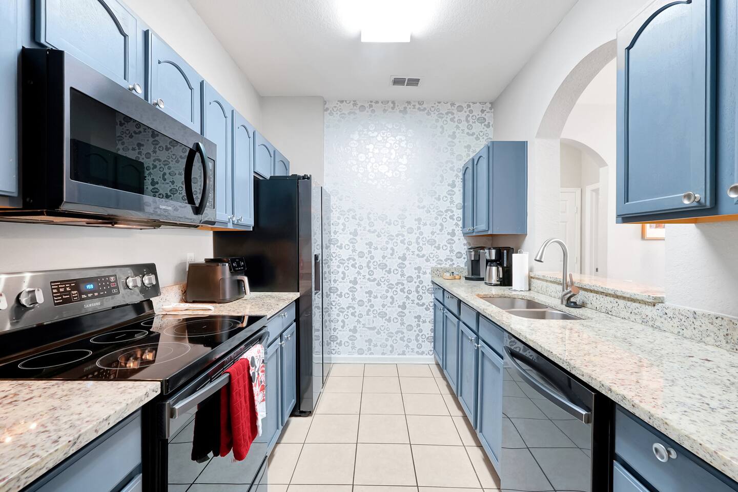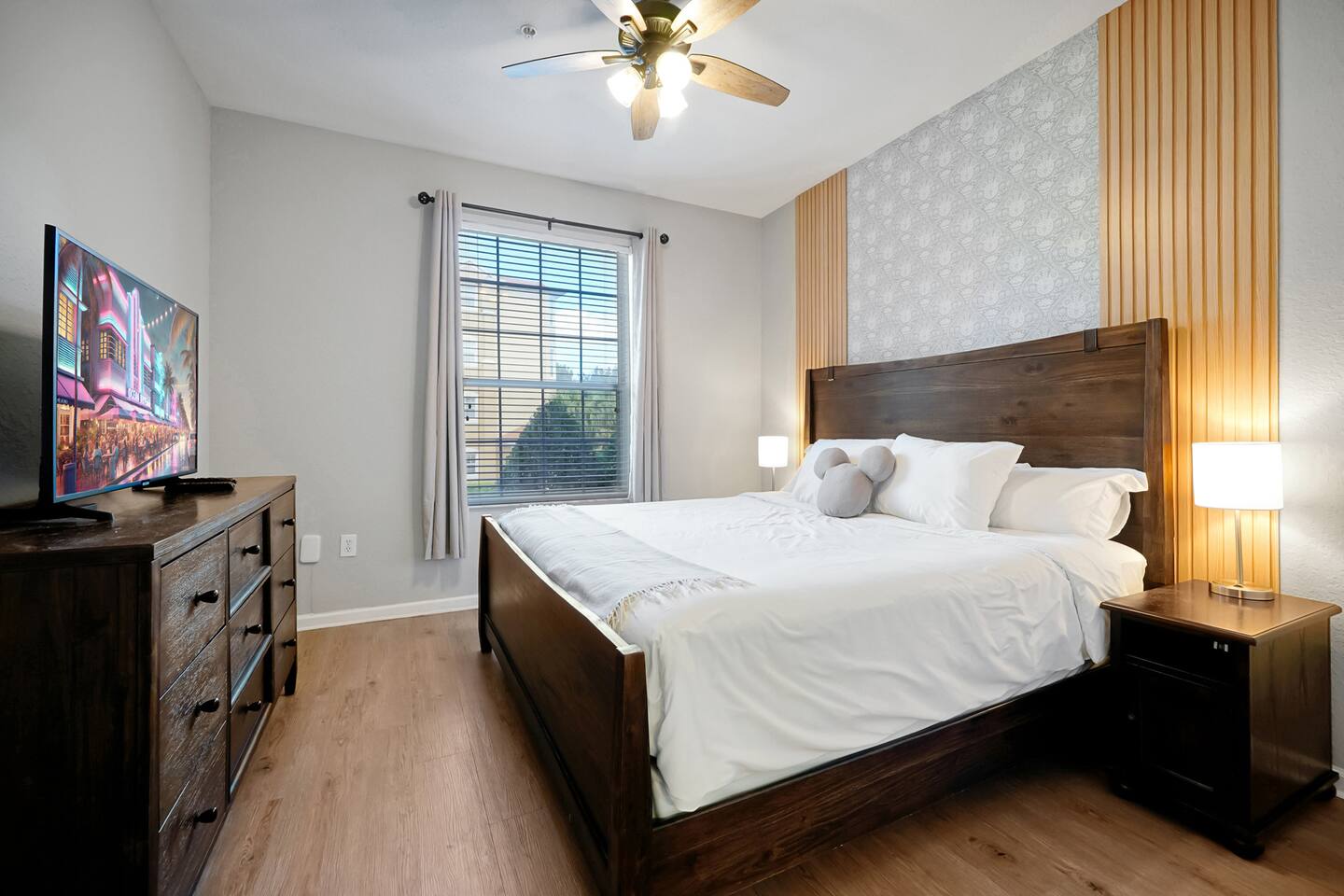 Please note: The water park will be closed from January 5th, 2026 to approximately February 14th, 2026 for refurbishment of the slides and fountains. The heated pool, spa and all other amenities will be open during this time. Please reach out with any questions. •2-bedroom, 2-bath condo just 2 miles from Disney World ✨ •Primary suite: 1 king bed, en suite bathroom, subtle Mickey wallpaper framed by modern wood panels, blackout curtains, and Smart TV 🛏️ •Second bedroom: 2 full beds, epic Star Wars mural ⚔️, themed artwork, blackout curtains, and Smart TV •Living room: Queen sleeper sofa, blackout curtains, Smart TV, and tasteful Disney artwork 🎨 •Kitchen: Fully stocked with all dishware/utensils, air fryer, blender, Keurig ☕, drip coffee maker, and more •In-unit washer & dryer for your convenience 🧺