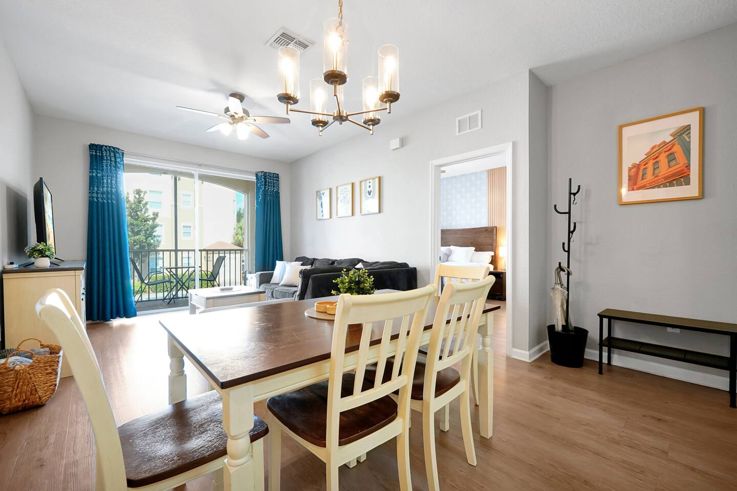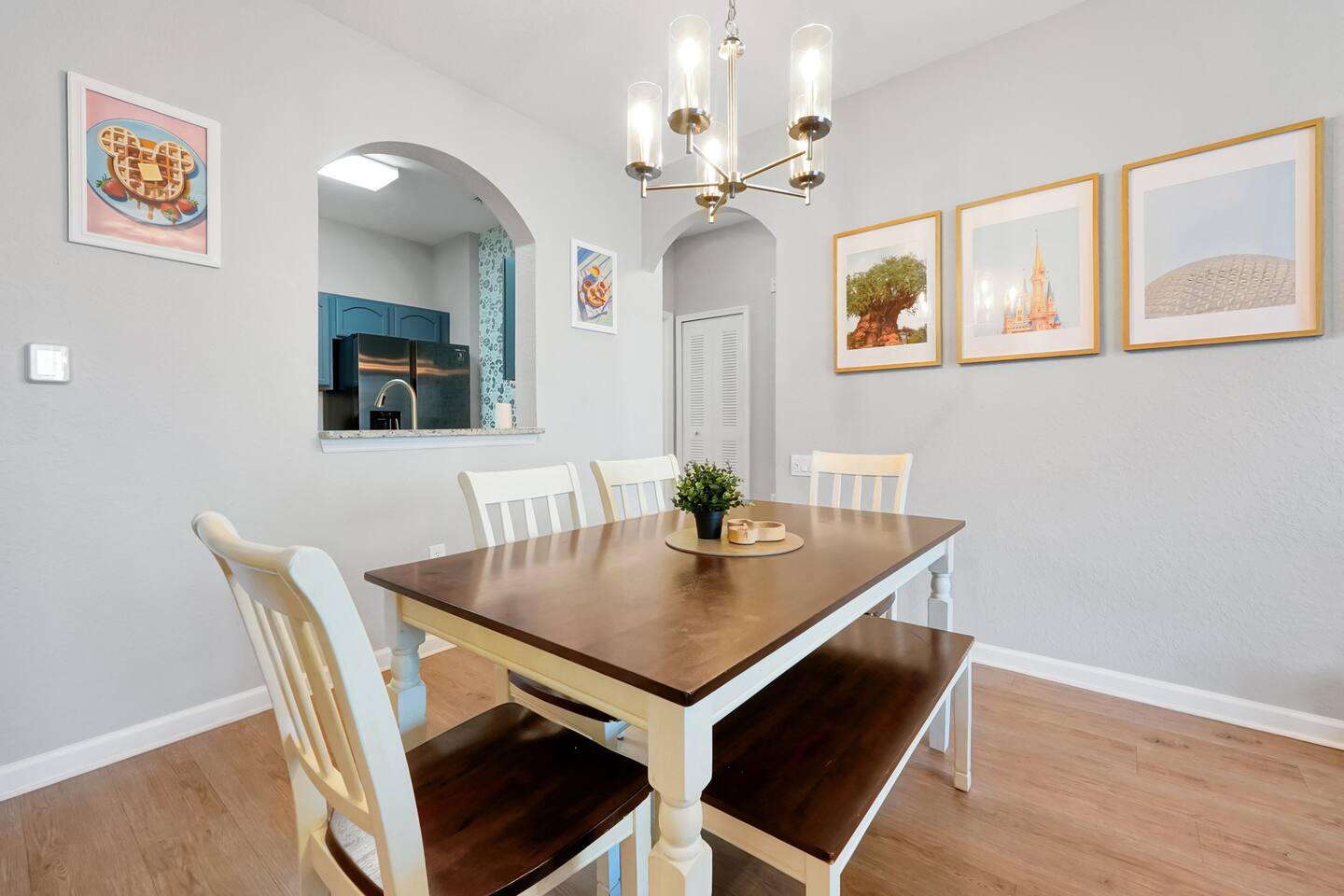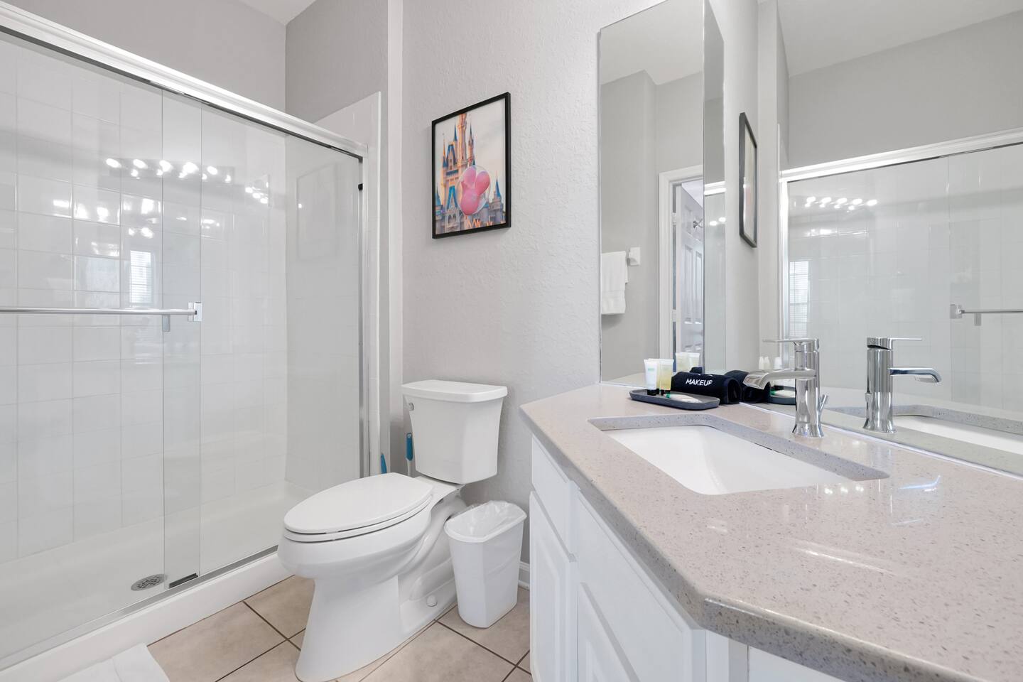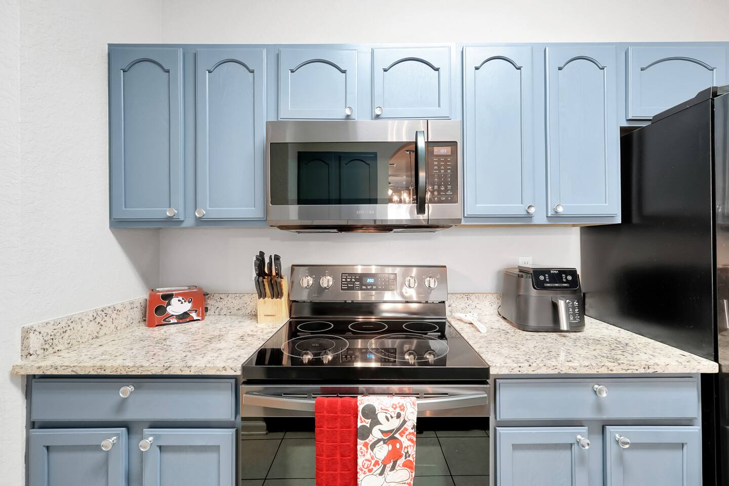 Please note: The water park will be closed from January 5th, 2026 to approximately February 14th, 2026 for refurbishment of the slides and fountains. The heated pool, spa and all other amenities will be open during this time. Please reach out with any questions. •2-bedroom, 2-bath condo just 2 miles from Disney World ✨ •Primary suite: 1 king bed, en suite bathroom, subtle Mickey wallpaper framed by modern wood panels, blackout curtains, and Smart TV 🛏️ •Second bedroom: 2 full beds, epic Star Wars mural ⚔️, themed artwork, blackout curtains, and Smart TV •Living room: Queen sleeper sofa, blackout curtains, Smart TV, and tasteful Disney artwork 🎨 •Kitchen: Fully stocked with all dishware/utensils, air fryer, blender, Keurig ☕, drip coffee maker, and more •In-unit washer & dryer for your convenience 🧺