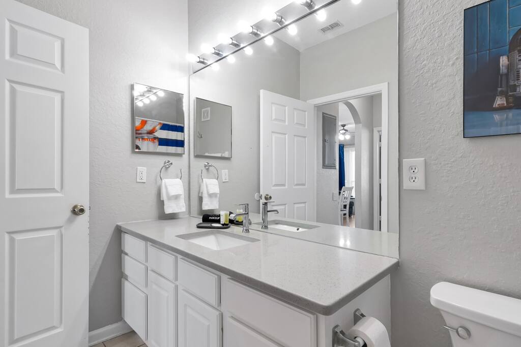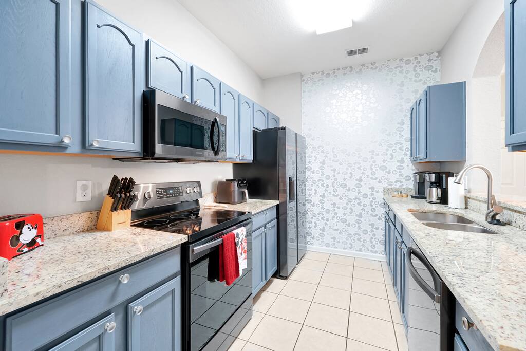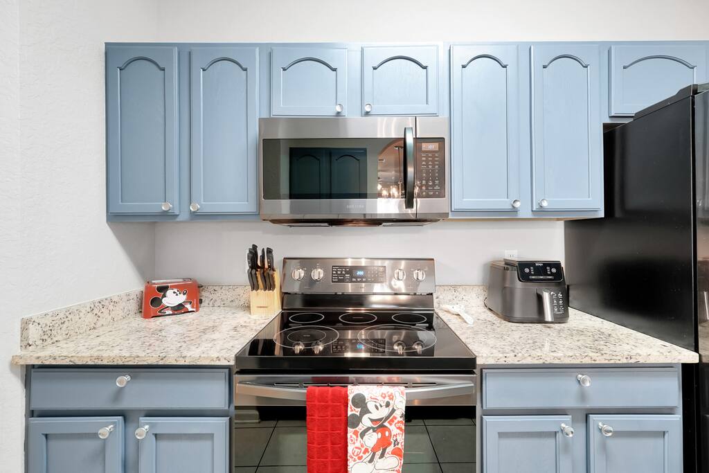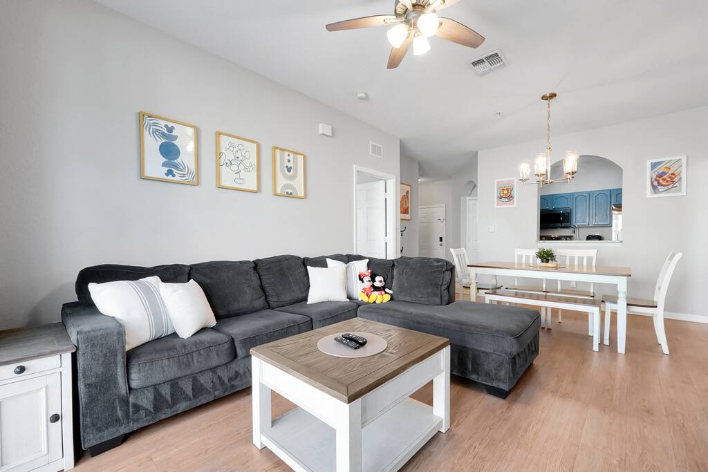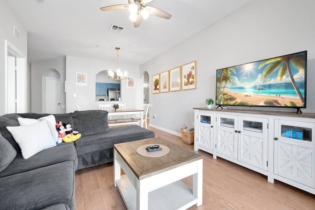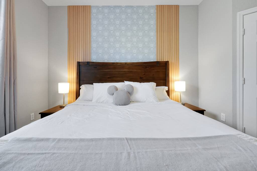•2-bedroom, 2-bath condo just 2 miles from Disney World ✨ •Primary suite: 1 king bed, en suite bathroom, subtle Mickey wallpaper framed by modern wood panels, blackout curtains, and Smart TV 🛏️ •Second bedroom: 2 full beds, epic Star Wars mural ⚔️, themed artwork, blackout curtains, and Smart TV •Living room: Queen sleeper sofa, blackout curtains, Smart TV, and tasteful Disney artwork 🎨 •Kitchen: Fully stocked with all dishware/utensils, air fryer, blender, Keurig ☕, drip coffee maker, and more •In-unit washer & dryer for your convenience 🧺